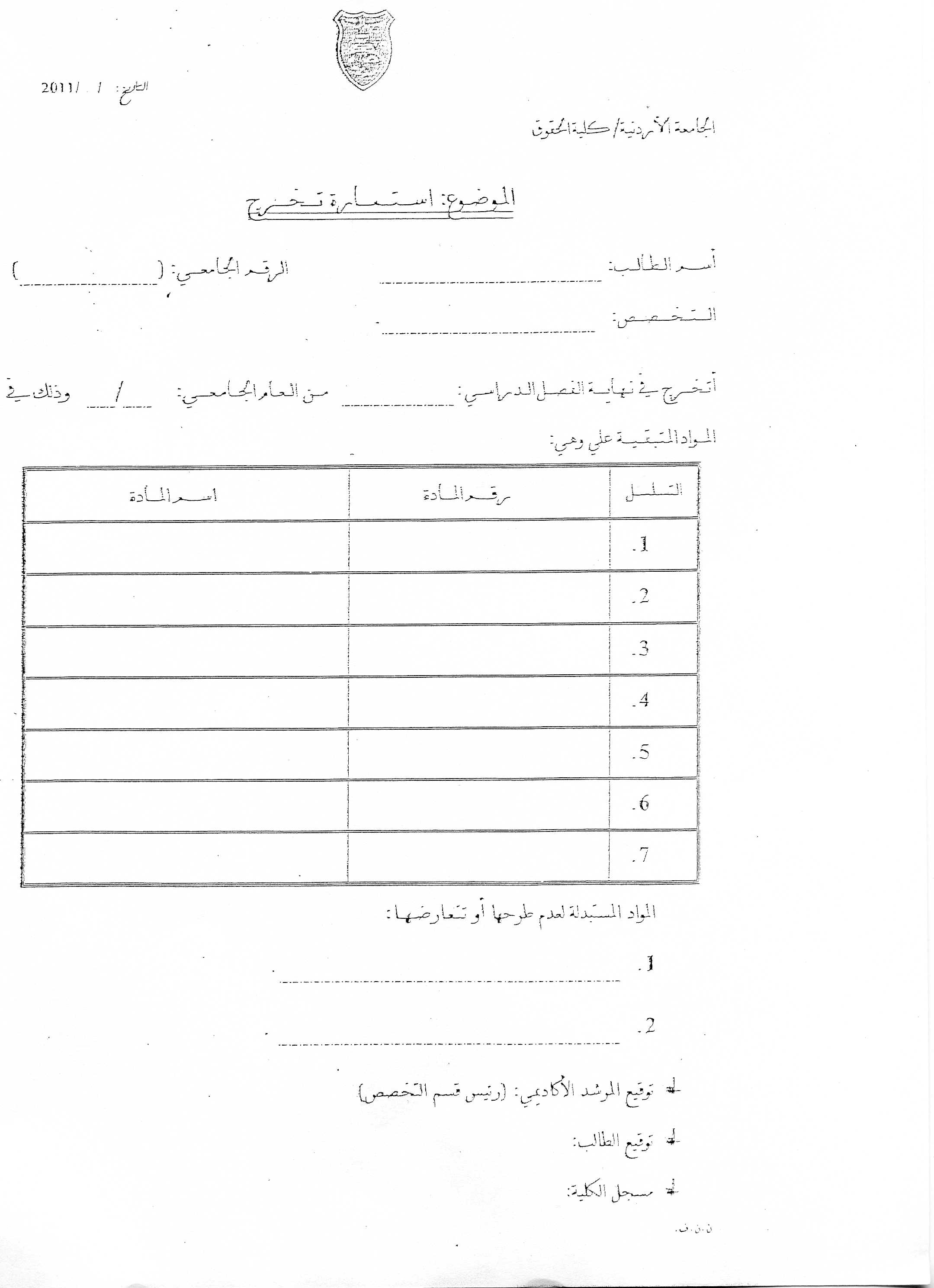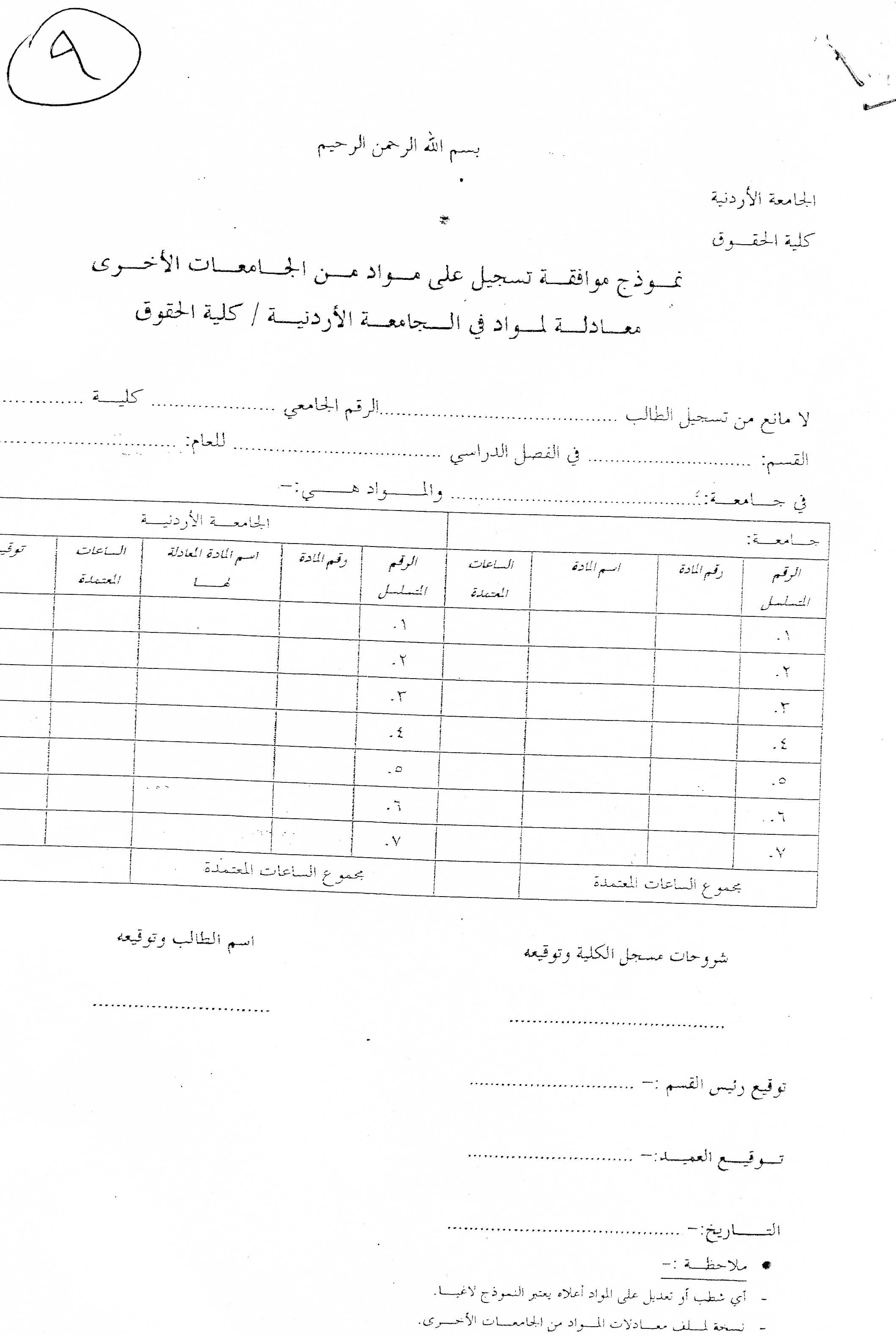 نموذج موافقة تسجيل على مواد من الجامعات الأخرى - معادلة لمواد في الجامعة الاردنية - كلية الحقوق